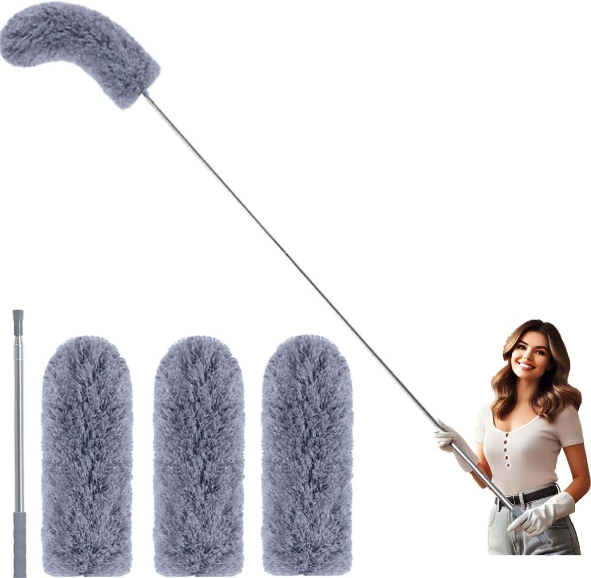 Long reach feather duster with extension pole for cleaning high ceilings and fans.